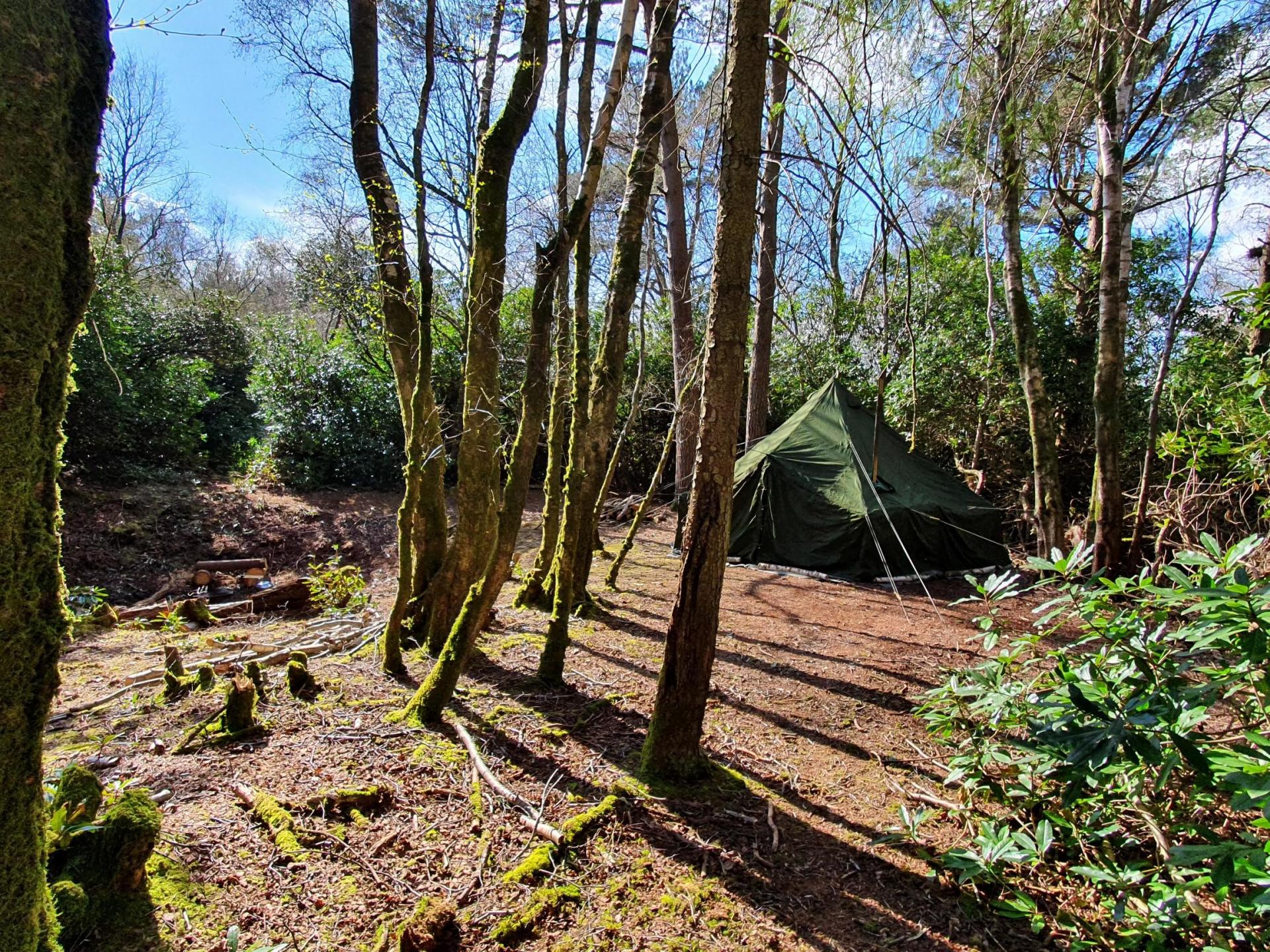 Decanter is a beautiful secluded woodland area with its own composting loo and bucket shower for total privacy. There is a natural hollow in the site where the fire pit and log seats are situated,creating a cosy space for boiling the kettle and listening to the woodland sounds. We provide a large fire kettle for heating water for the shower, and there is a tap about 20 metres away in the nearest car park. There is a large pitching site, big enough for two 5 metre bell tents, and plenty of hammock hanging spots. The pitch is about 4 acres in total, with paths connecting you to the parking area, tracks and other pitches. We will be providing logs every day, but note we are not selling extra logs this season.